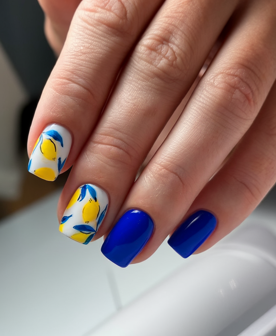 This short square manicure features a combination of deep blue nails and white nails with hand-painted lemon art, creating a bright and refreshing contrast. The gel technique enhances the shine and longevity of the colors, making it a trendy summer choice. The detailed yellow and blue leaves add a Mediterranean feel, making it perfect for a vacation-ready manicure. This playful yet elegant design suits anyone looking for a new and bold nail trend.