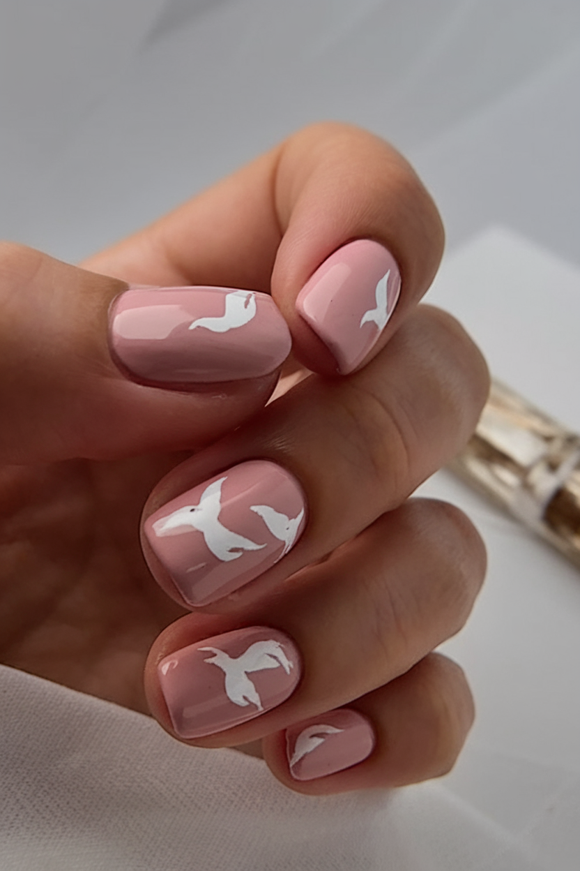 A chic short square design featuring a soft pink base with delicate white bird silhouettes, creating a serene and elegant look. The gel polish provides a glossy finish, making the details pop while keeping the overall style simple and trendy. This design is perfect for a spring or summer getaway, offering a soft yet artistic aesthetic. A beautiful choice for those who prefer subtle, nature-inspired manicure ideas.