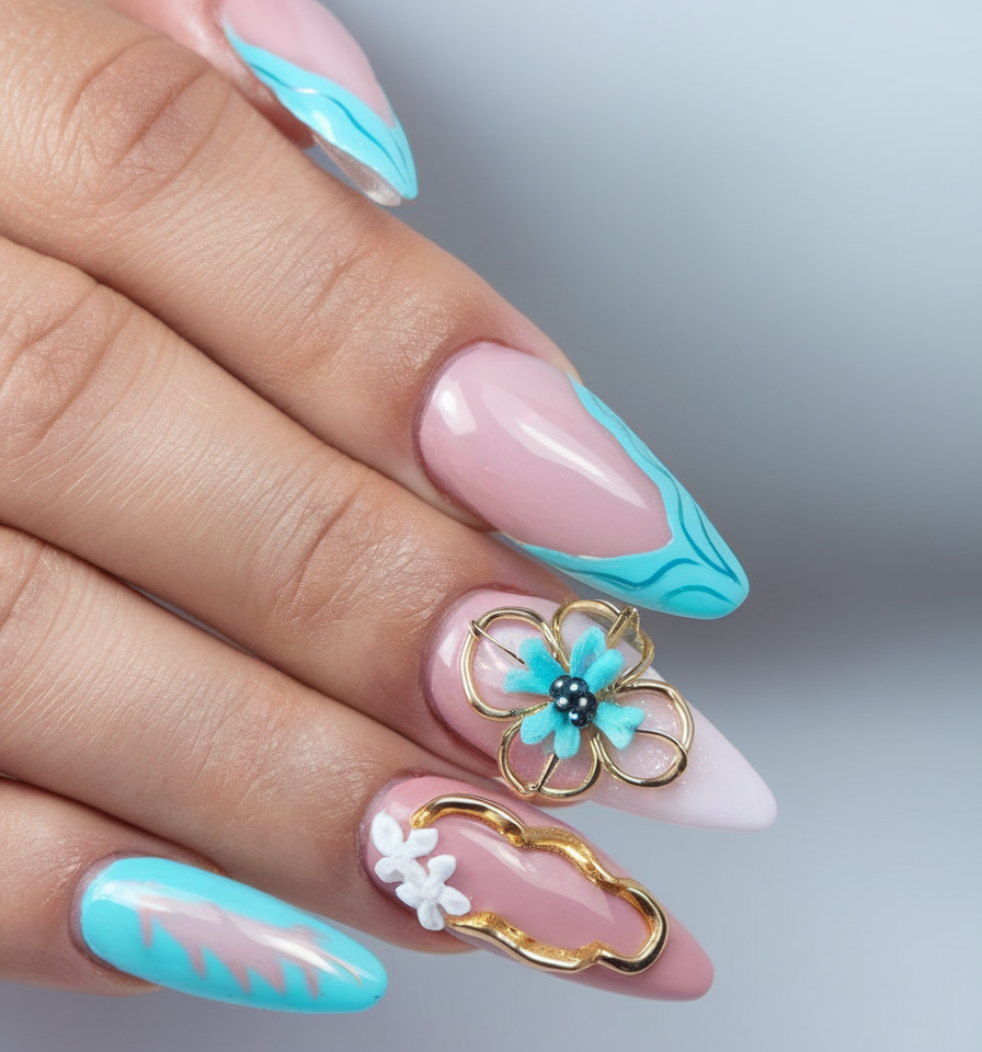 This long almond manicure blends blue and pink tones with delicate gold accents and 3D floral embellishments, creating a luxurious and artistic look. The gel technique ensures a flawless shine, while the wave-like designs add movement and depth. The combination of trendy blue hues and intricate details makes it a standout choice for a spring or summer vacation. A perfect new nail trend for those who love bold yet elegant designs.