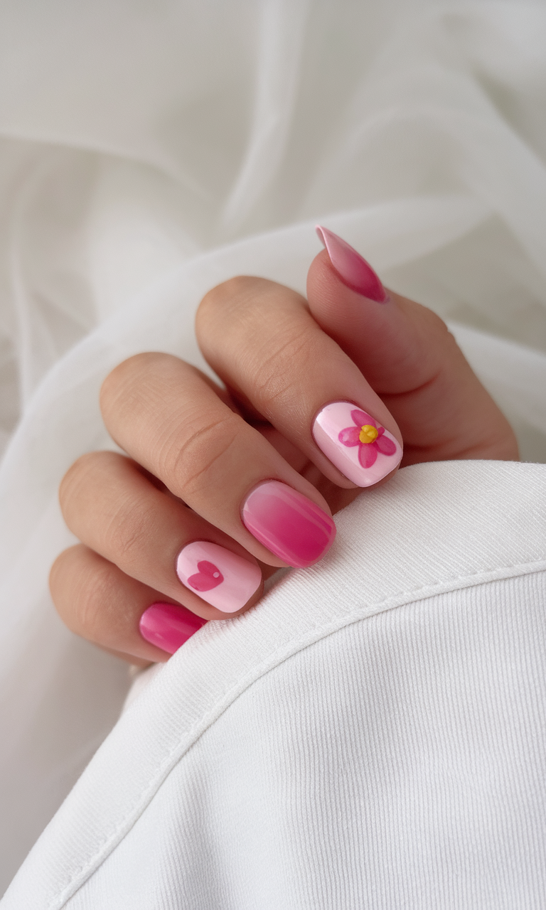 This short square nail design features a mix of pink gradients, hearts, and tiny floral accents, making it a perfect birthday or Nye manicure. The simple yet trendy gel polish gives the nails a soft, glossy finish, while the delicate details add a playful touch. The mix of light and deep pink shades makes this look both youthful and stylish. A great choice for those who love soft, feminine nail art with a romantic feel.