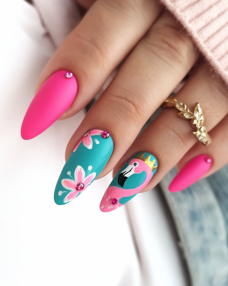 This long almond-shaped design features a bold mix of pink and green shades with a detailed hand-painted flamingo wearing a crown. The gel polish finish ensures vibrant colors, while tiny rhinestone accents add a touch of glamour. The combination of trendy summer colors and tropical elements makes it a perfect vacation-ready manicure. This new trend is ideal for those looking for fun, bright nail art with a bold statement.