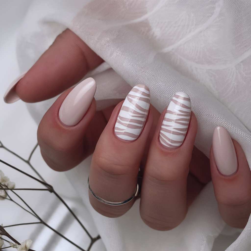 This long almond nail design features a soft nude base complemented by white zebra stripe accents, adding a touch of texture and sophistication. The gel finish enhances the glossy effect, making the nails appear sleek and polished. This trendy yet simple look is perfect for a spring or summer vacation, offering a modern twist on classic neutral tones. A great choice for those who prefer stylish yet subtle nail art.