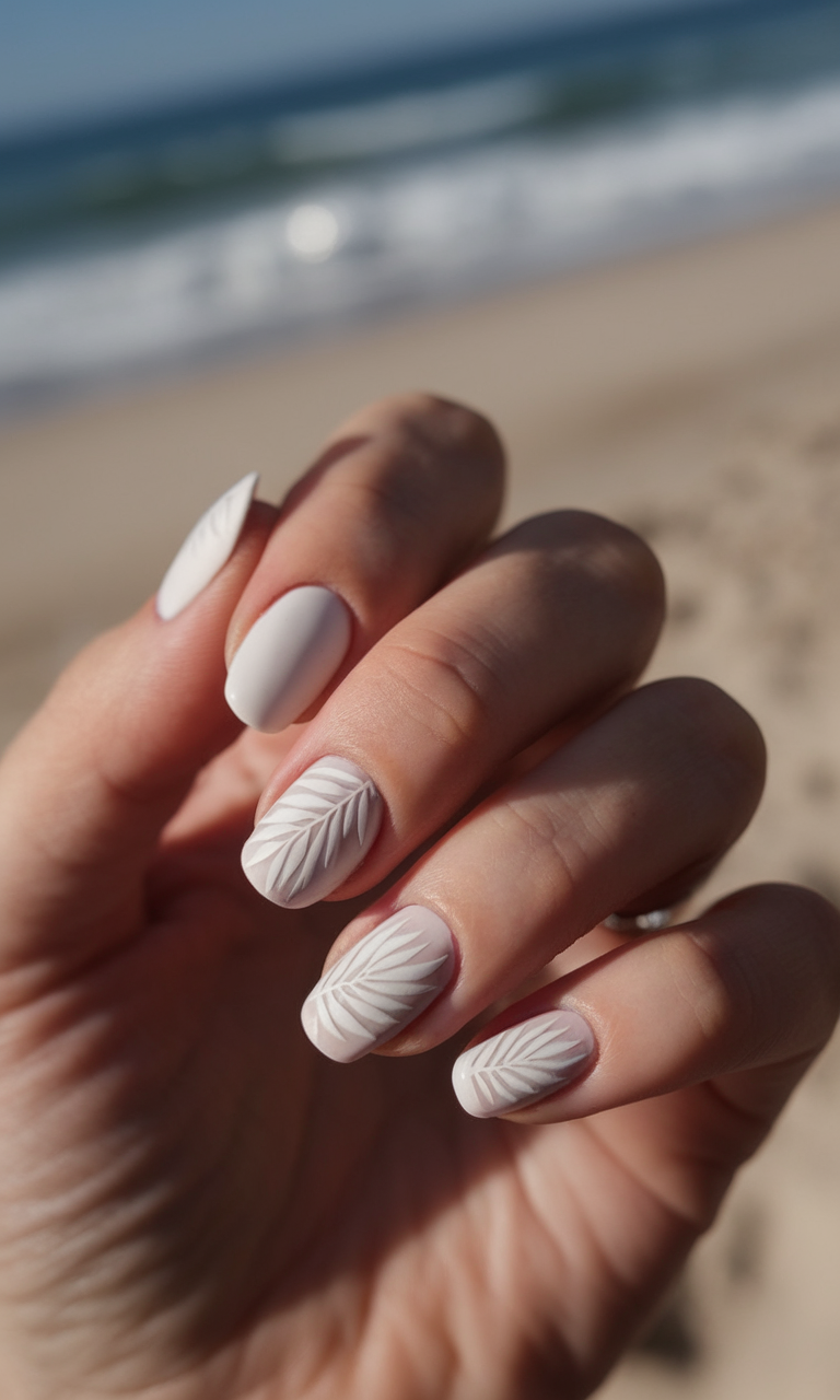 This short square manicure showcases a pure white matte finish, with 3D embossed leaf patterns for an elevated, textured effect. The monochromatic design gives a trendy yet natural feel, perfect for a March getaway or a vacation-ready look. The gel technique ensures durability while maintaining a soft, modern touch. This simple yet elegant nail art is ideal for those who love minimalist and nature-inspired aesthetics.