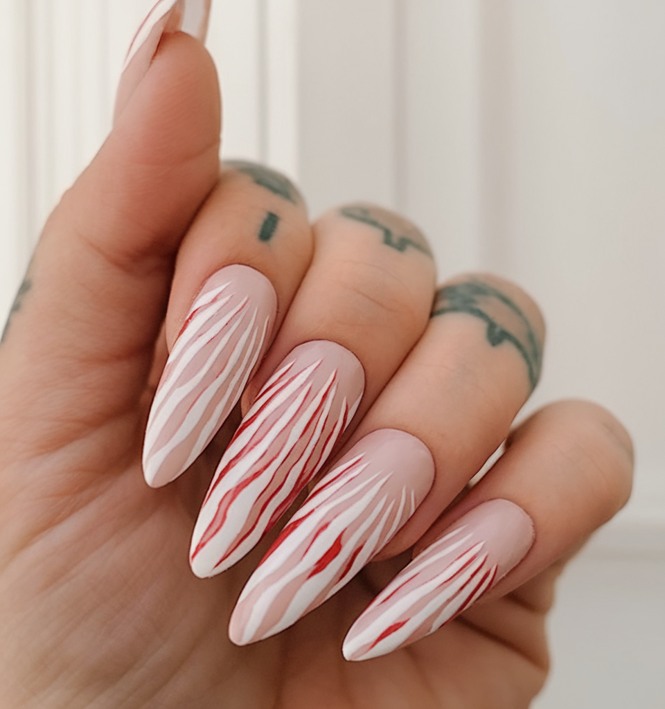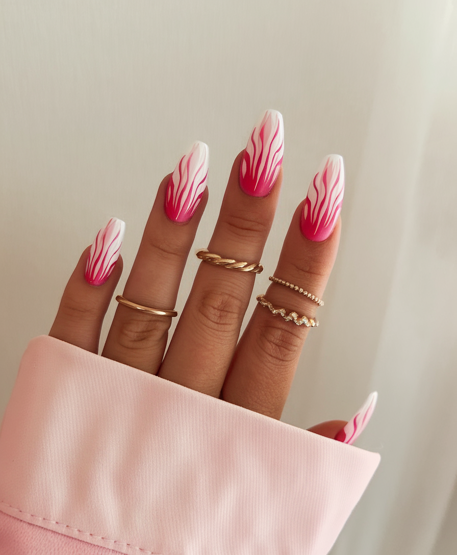 This long stiletto manicure features a striking red and white flame pattern, creating a fierce and dramatic effect. The sharp nail shape enhances the intensity of the design, making it a bold choice for a birthday party, Nye celebration, or a summer trend. The gel polish finish provides a glossy and lasting shine, ensuring a high-impact look. This trendy new style is perfect for those who love statement nails with an edgy twist.