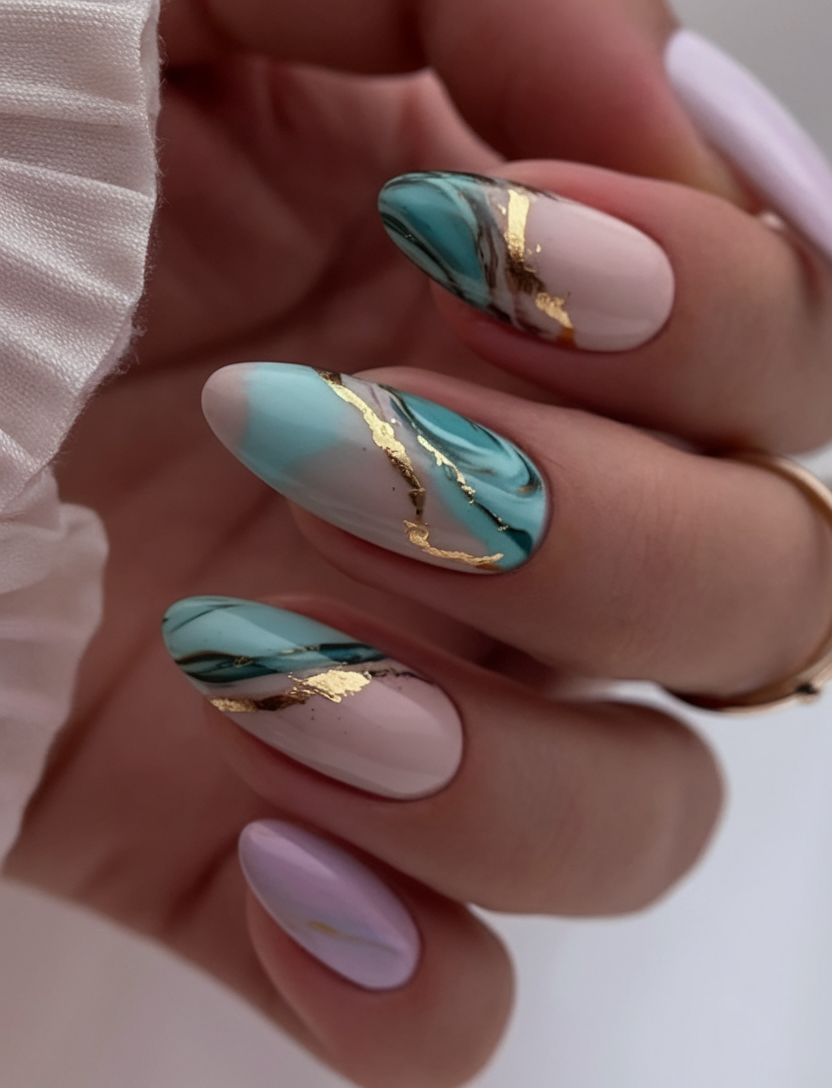 This almond-shaped manicure features a soft nude base with blue-green marble swirls and delicate gold foil accents. The gel polish finish enhances the depth of the design, making it a trendy choice for a vacation or birthday celebration. The fluid pattern mimics ocean waves, adding an elegant and luxurious touch. A perfect new nail trend for those who love artistic yet sophisticated designs.