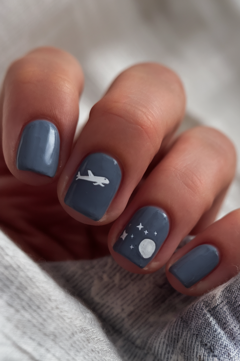 This short square manicure showcases a deep blue gel polish with white travel-themed accents, including an airplane and a moonlit sky with stars. The simple yet trendy design is perfect for travel lovers or those looking for a unique vocation nails idea 2025. The glossy finish enhances the rich color, making it a stylish choice for a March getaway or Nye party. A perfect way to express a love for adventure through nail art.