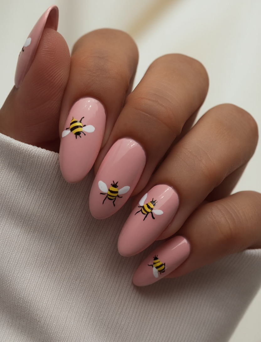 #9 Playful Pink Nails with Tiny Bumblebee Designs