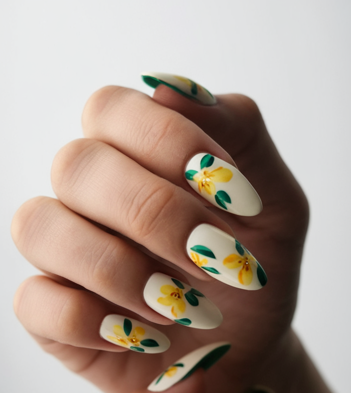 This long almond manicure features a soft cream base adorned with hand-painted yellow flowers and green leaves, creating a fresh and natural look. The gel polish finish provides a smooth, glossy effect, making this design perfect for a spring or summer vacation. The simple yet trendy floral accents add a touch of elegance while maintaining a playful aesthetic. A perfect choice for those who love nature-inspired and feminine nail art.