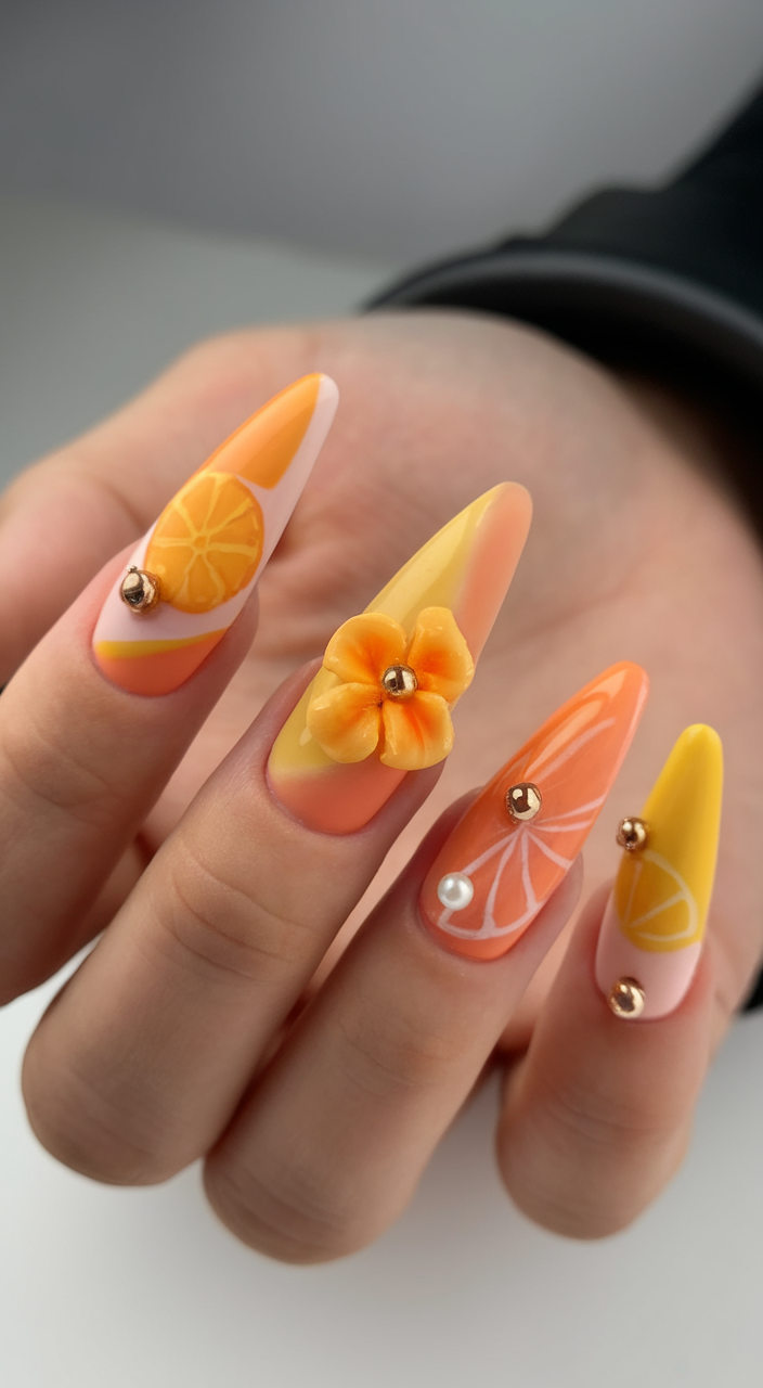 #7 Citrus-Inspired 3D Orange and Floral Nail Art