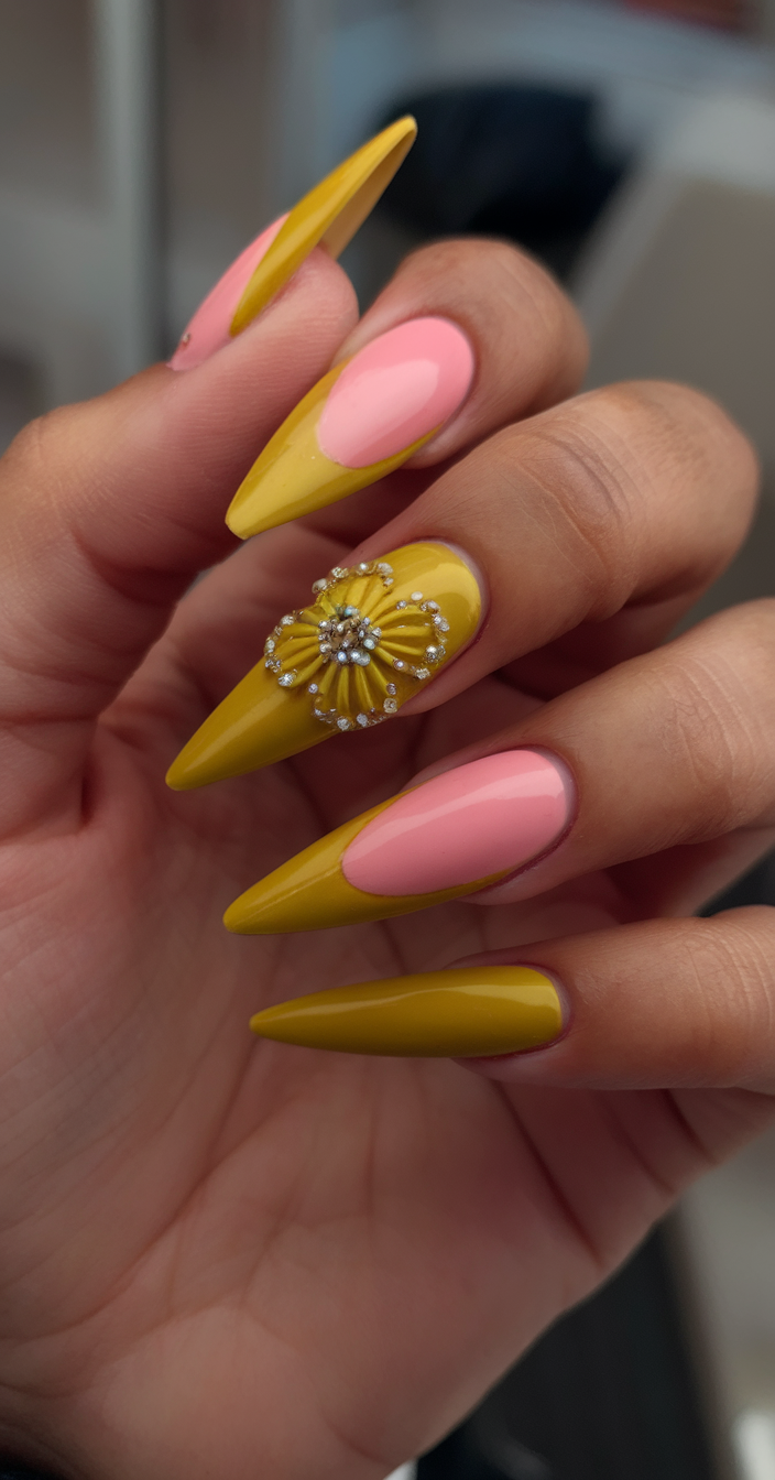 This long stiletto nail design features a bold combination of soft pink and deep yellow, with a statement crystal floral embellishment. The gel polish finish enhances the vibrancy of the colors, creating a trendy yet elegant contrast. The sharp nail shape adds a dramatic edge, making it perfect for a Nye party, birthday, or vacation look. A new trendy style for those who love glamorous and high-fashion manicures.