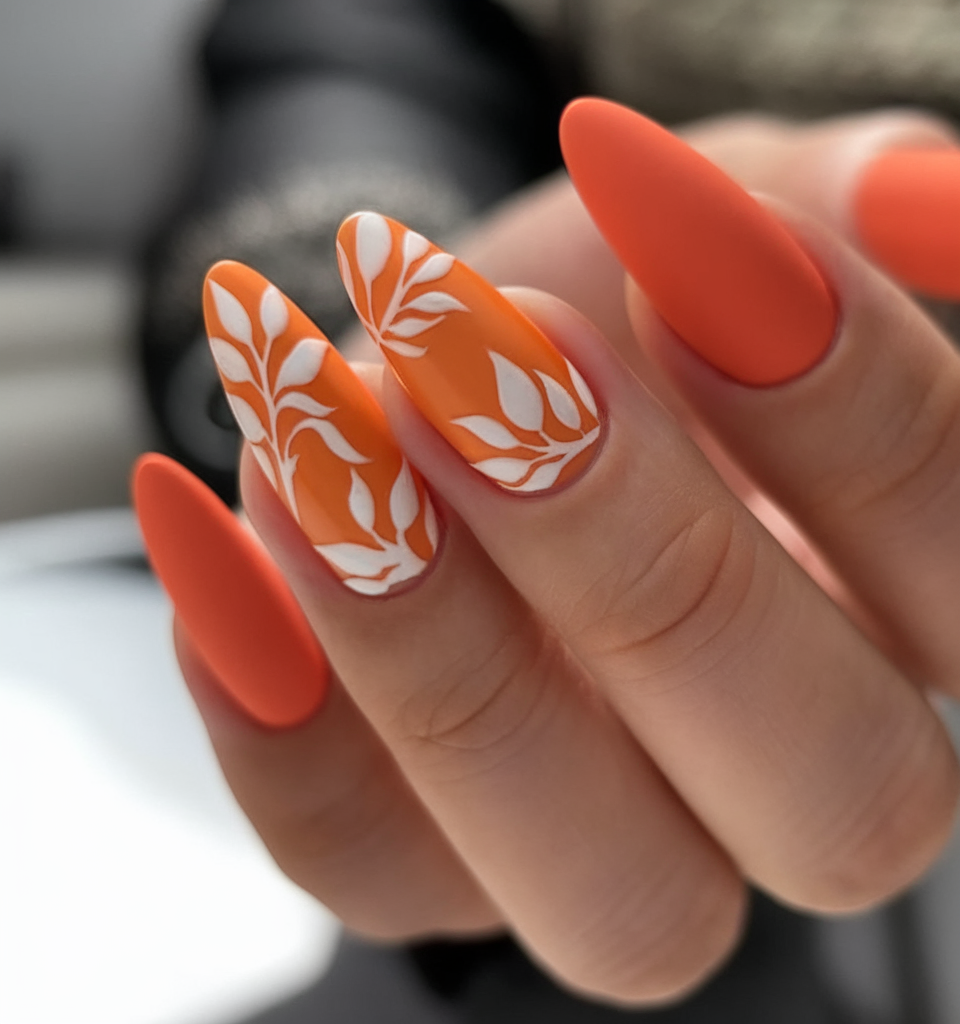 This long almond-shaped manicure features a vibrant matte orange base, with accent nails decorated in white leaf patterns for a fresh and natural effect. The gel polish finish enhances the smooth texture of the matte, making it perfect for a trendy summer or spring look. The design is both simple and elegant, adding a bold pop of color while maintaining a soft, organic touch. A great choice for those who love bright yet minimalistic nail art.