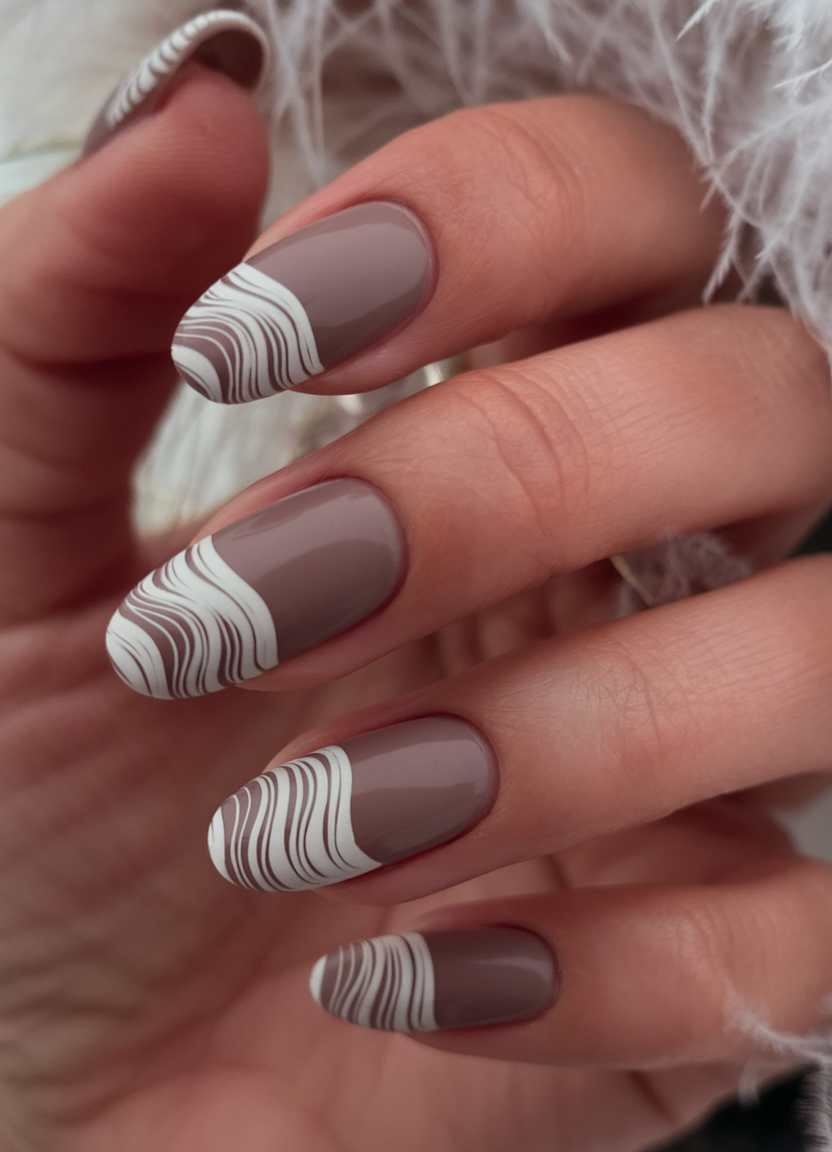This long almond nail design showcases a rich mocha brown base paired with white wavy French tips, creating a sophisticated and modern aesthetic. The gel polish finish gives a sleek, high-gloss shine, making it perfect for a March getaway or a trendy everyday look. The curved lines add an artistic and contemporary feel while maintaining a simple yet stylish appearance. A great alternative to classic white French tips with a creative twist.