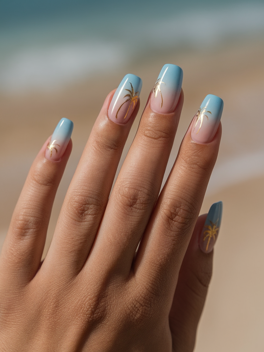 This long square manicure features a soft blue-to-nude ombre gradient, complemented by delicate gold palm tree accents for a tropical vacation vibe. The gel finish enhances the smooth transition of colors, giving a polished and refined look. This trendy yet simple design is ideal for a beach vacation or summer getaway, offering a stylish and effortless aesthetic. A perfect vocation nails idea 2025 for those who love elegant, travel-inspired designs.