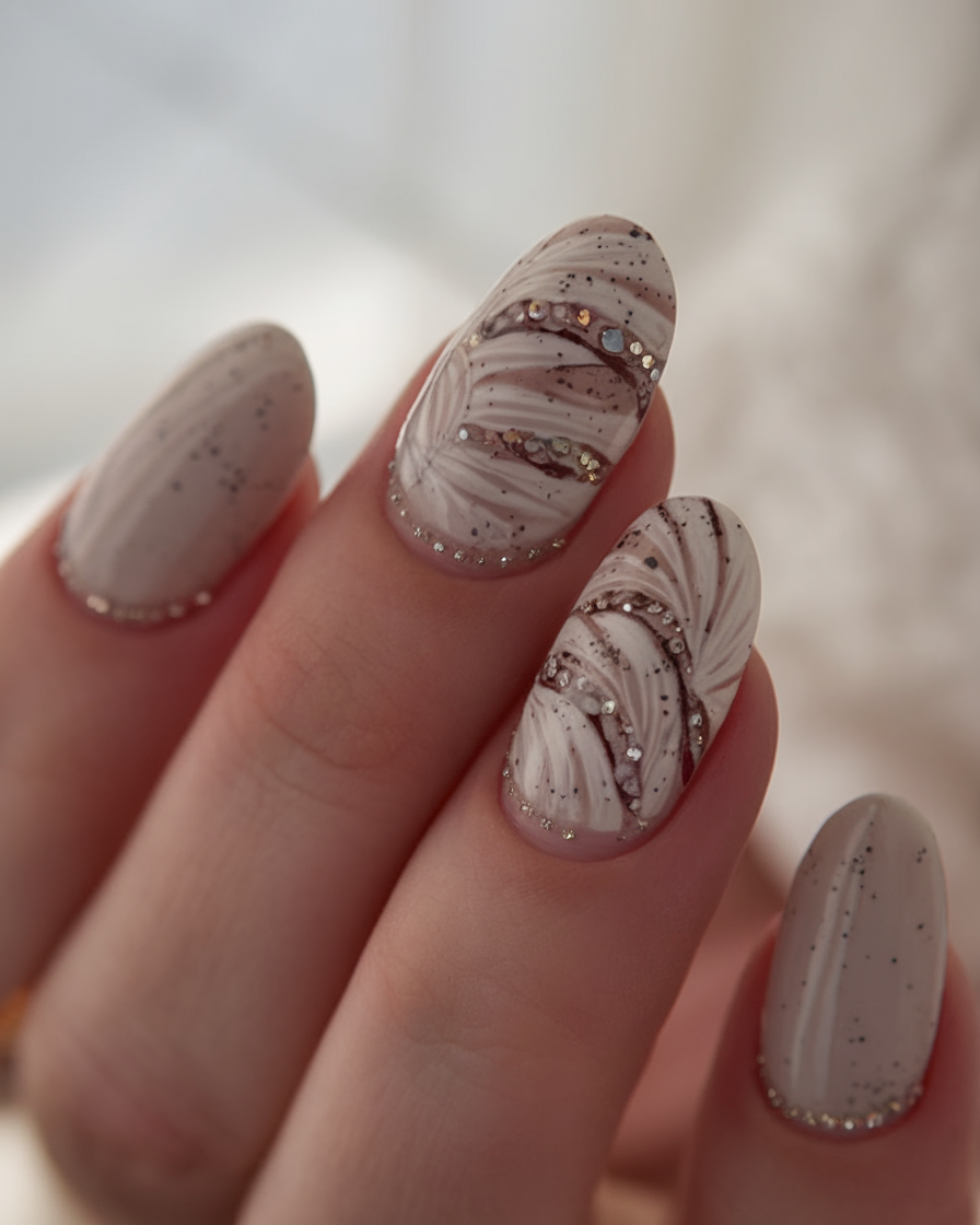 This long almond manicure features a soft beige base with intricate marble swirls in white and brown, enhanced by delicate rhinestone details. The gel polish finish adds depth to the design, while fine glitter accents bring a subtle sparkle. This trendy yet sophisticated look is perfect for a birthday, vacation, or Nye celebration. A beautiful blend of neutral tones and luxury-inspired details.