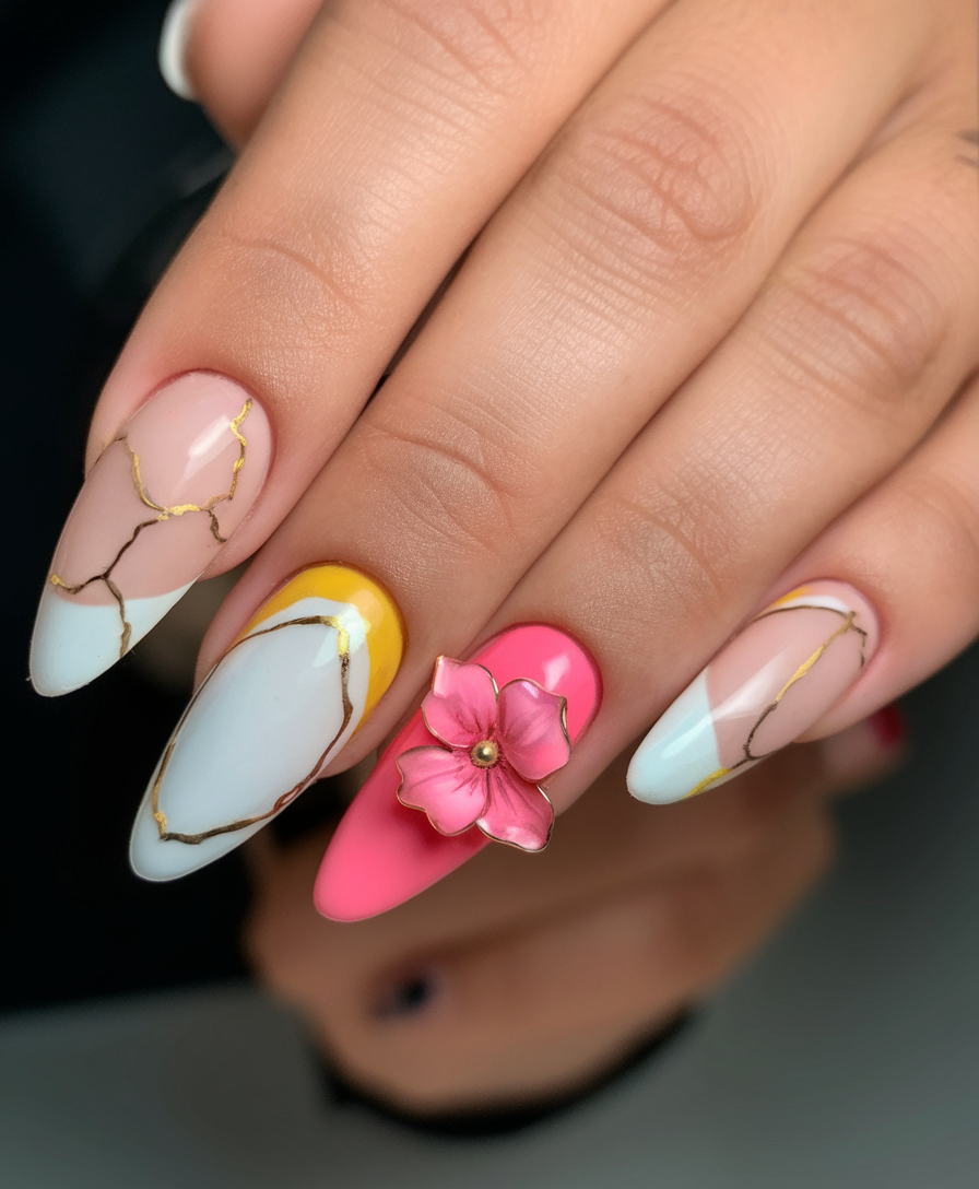 This long almond design combines pink, white, and yellow shades with gold kintsugi-style accents for an artistic and elegant finish. The standout feature is a 3D pink floral embellishment, adding depth and texture. This design fits various occasions, from a Nye party to a birthday celebration, offering a red-carpet-ready look. Perfect for those who love gel manicures with a trendy and unique twist.