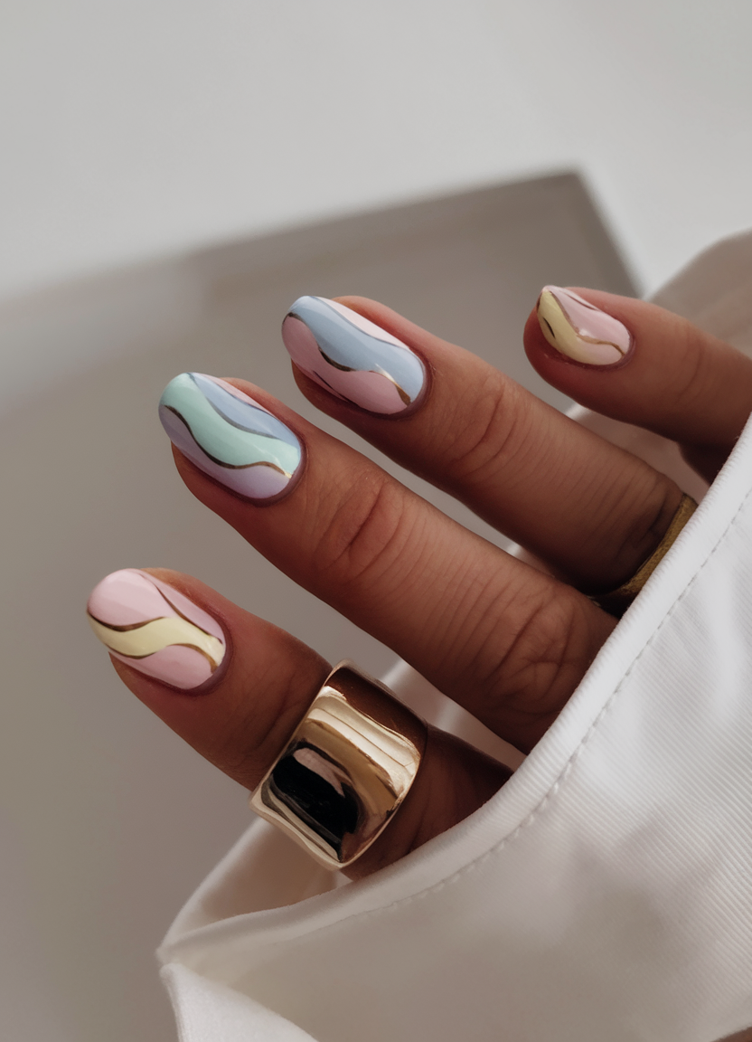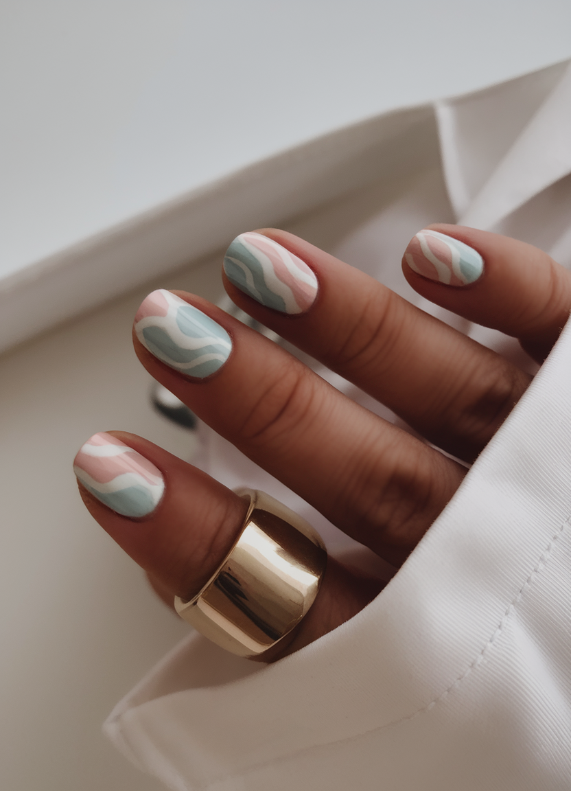This short square nail design blends soft blue, pink, and green shades in a fluid wave pattern, outlined with fine gold details. The mix of cool and warm tones makes it a perfect spring and summer trend for those who love simple yet trendy nails. The gel finish enhances the glossy effect, giving the nails a polished and elegant look. This style is perfect for a March getaway or a birthday celebration, adding a delicate and artistic touch to any look.