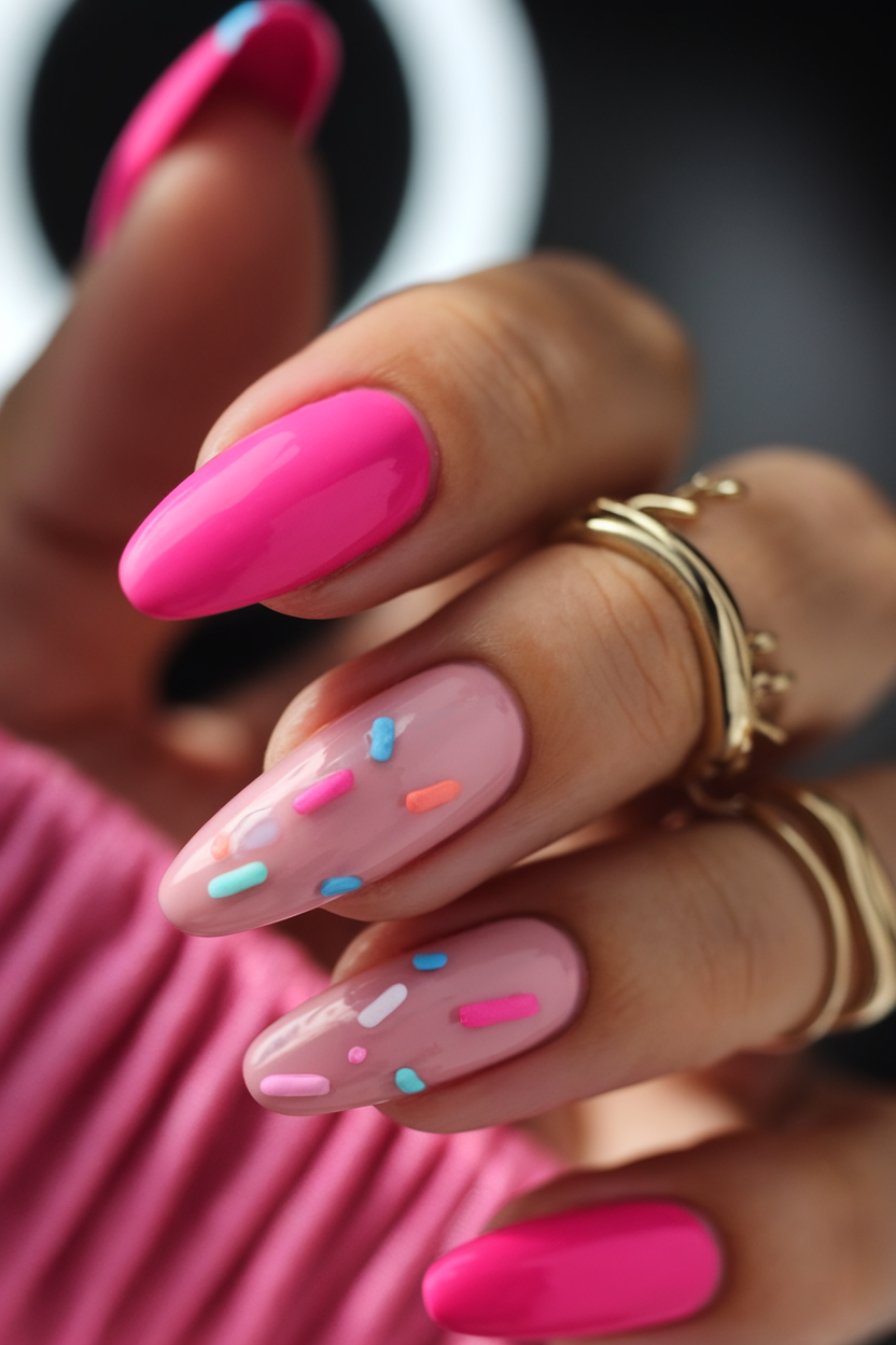 A bold pink manicure with a fun sprinkle-inspired accent brings a fresh, new trend to vocation nails ideas 2025. The long almond shape enhances the sleekness of the look, while the gel technique ensures a lasting shine. The combination of a solid, trendy pink and a playful candy-like accent makes it perfect for a birthday or Nye party. This design suits those who love bright, eye-catching nails with a touch of fun.