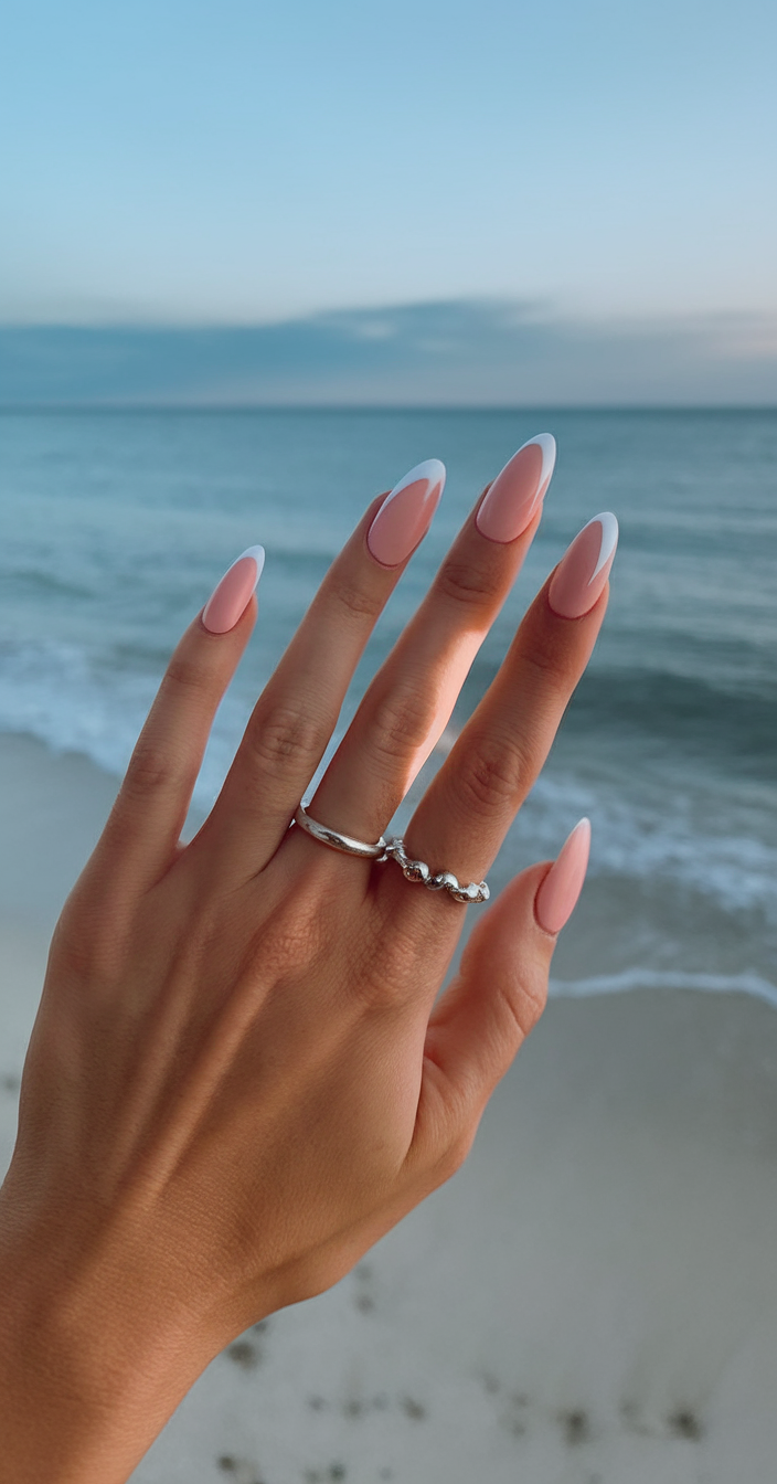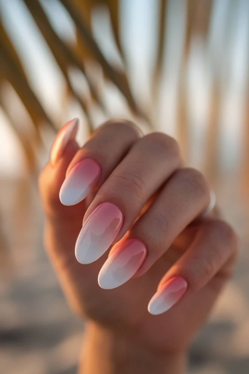 A sophisticated almond-shaped manicure featuring a smooth white-to-nude ombre effect, perfect for a spring or summer getaway. This gel design is both timeless and elegant, making it an excellent choice for a March vacation or a beachside escape. The long, tapered shape adds a feminine and refined touch, while the soft gradient complements any outfit. This simple yet trendy design is a great alternative to traditional red or black nails.
