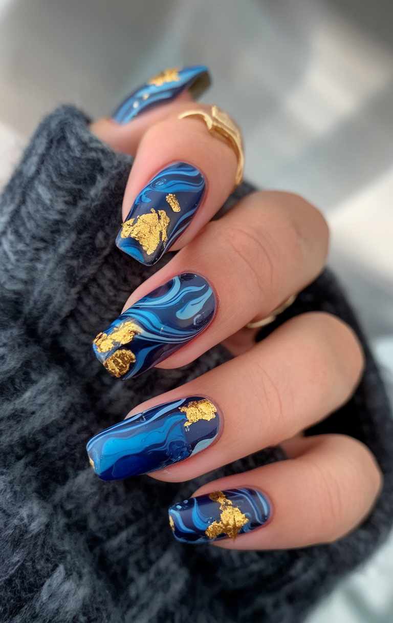 A luxurious mix of blue marble swirls with gold foil accents, this square-shaped design is perfect for a trendy and artistic manicure. The deep blue base gives a rich, oceanic feel, while the metallic gold flakes add an elegant contrast. This gel nail technique creates a glossy, dimensional effect, making it a perfect choice for a birthday, vacation, or formal event. A great alternative to classic black nails with a creative twist.
