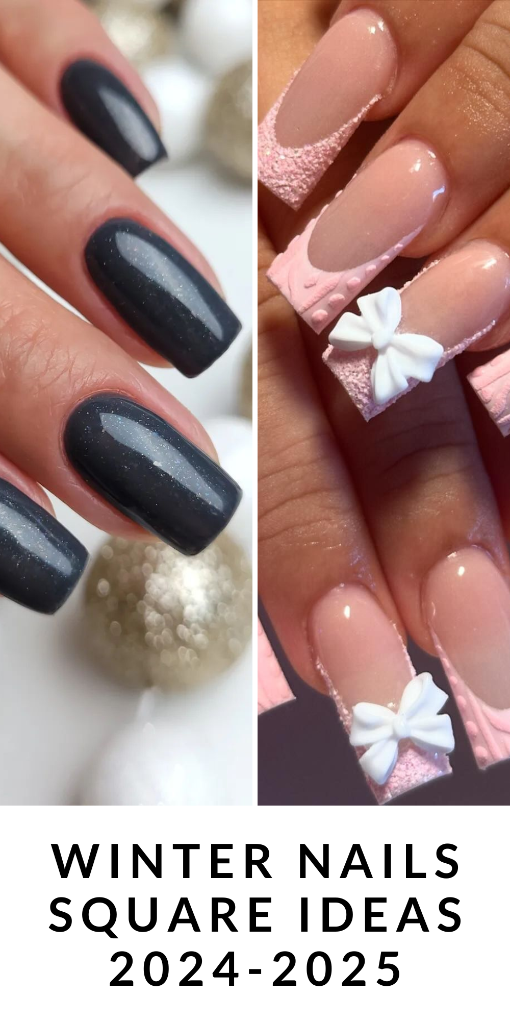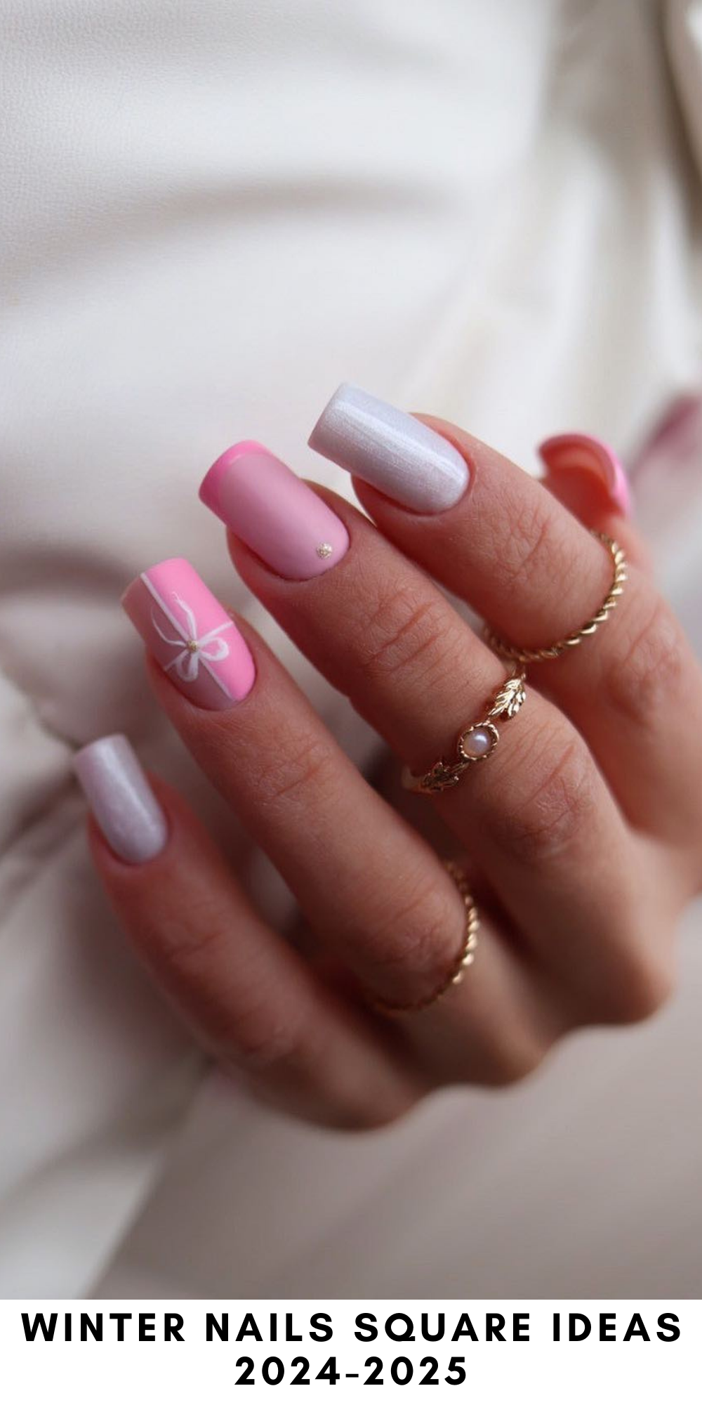 These soft pink square nails feature a combination of glossy and matte finishes with a charming bow accent. The medium length and light color make it a versatile choice for a subtle, feminine winter style. Ideal for anyone who prefers a simple and elegant look.