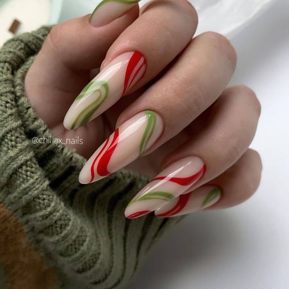 These nails bring a nostalgic twist to the Sagittarius palette with their candy cane-inspired swirls. The playful dance of red and green on a clear base is a nod to the sign’s fun-loving spirit. The long and almond shape keeps the look trendy and 2024 gel short-ready, making it a delightful choice for a bday celebration or simply to sweeten your everyday style.