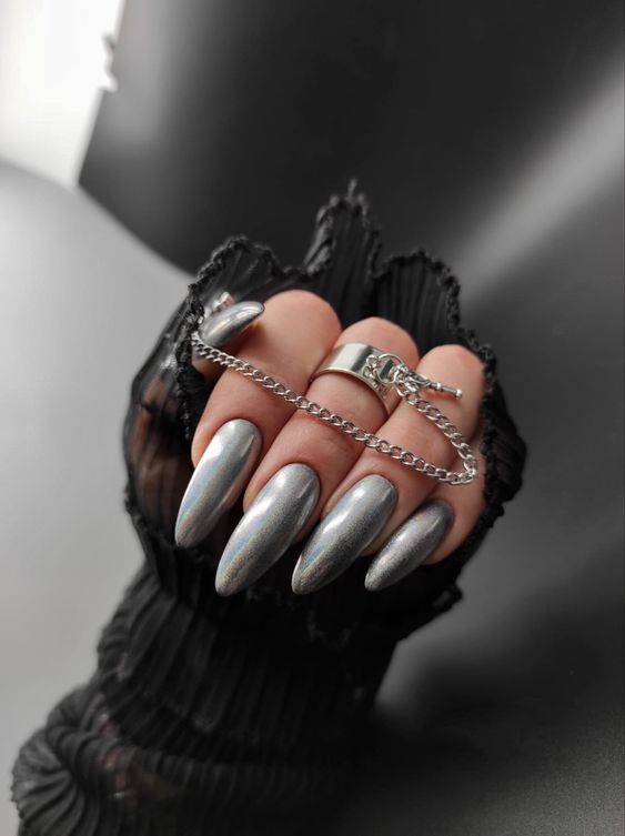 The metallic charcoal nails exude a sleek and sophisticated vibe, perfect for the Sagittarius who commands a room with her presence. The reflective surface and oval shape of the nails are reminiscent of the night sky that Sagittarius loves to explore. This set with its gel finish is a modern twist on classic black, ideal for those extra birthday parties or for creating a baddie aesthetic.
