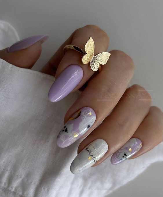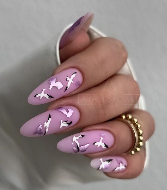 Lilac is a color that conjures images of early spring days, and the silhouettes of birds in flight add a touch of whimsical inspo. The oval shape of these nails provides a classic, feminine feel that fits effortlessly into a baddie or acrylic long style. It’s a design that speaks to the Sagittarian love of freedom and the joy of life’s simple pleasures, making it a top pick for an 18th birthday or a day out with friends.