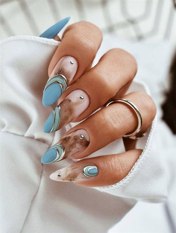Sagittarius, your free spirit is like the wind—unseen but felt, and this serene sky blue with swirls of white captures that essence perfectly. The long, stiletto nails are a canvas for the soft, curving lines, reminiscent of clouds against a clear blue sky. Adorned with subtle rhinestones, they are the perfect blend of exotic and elegant, suitable for any birthday celebration or as a daily reminder of the expansive sky above.