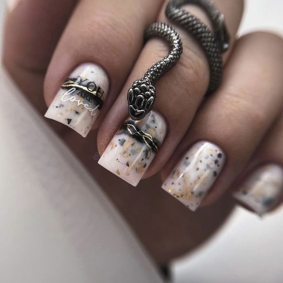 Terrazzo brings to mind the artistry of mosaic floors, and these nails transform that inspiration into a modern masterpiece. The combination of black, red, and gold flakes creates a luxurious feel, with a gel almond shape that’s both contemporary and trendy. Whether it’s for a 21st birthday or to add a touch of magic to everyday life, these nails are a testament to the Sagittarian’s love of art and design.