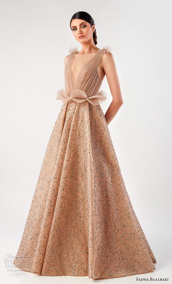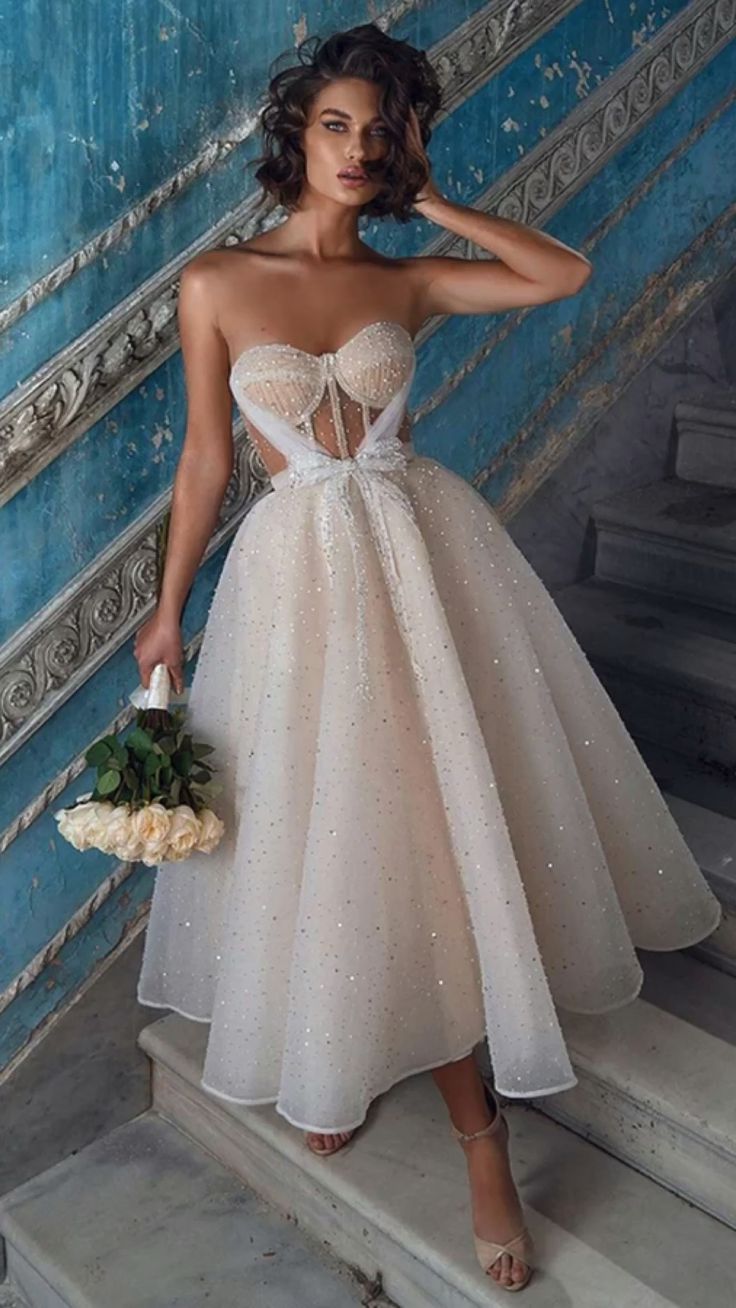 Here we have a duo of A-line dresses that are as joyful as a summer day. On the left, a sunny yellow gown with a sheer, puffed sleeve exudes a trendy vibe, while its partner in pink whispers princess romantic dreams. Both gowns are sprinkled with a dusting of sparkle, perfect for the bride who wants to bring a touch of whimsical color to her beach or garden wedding.