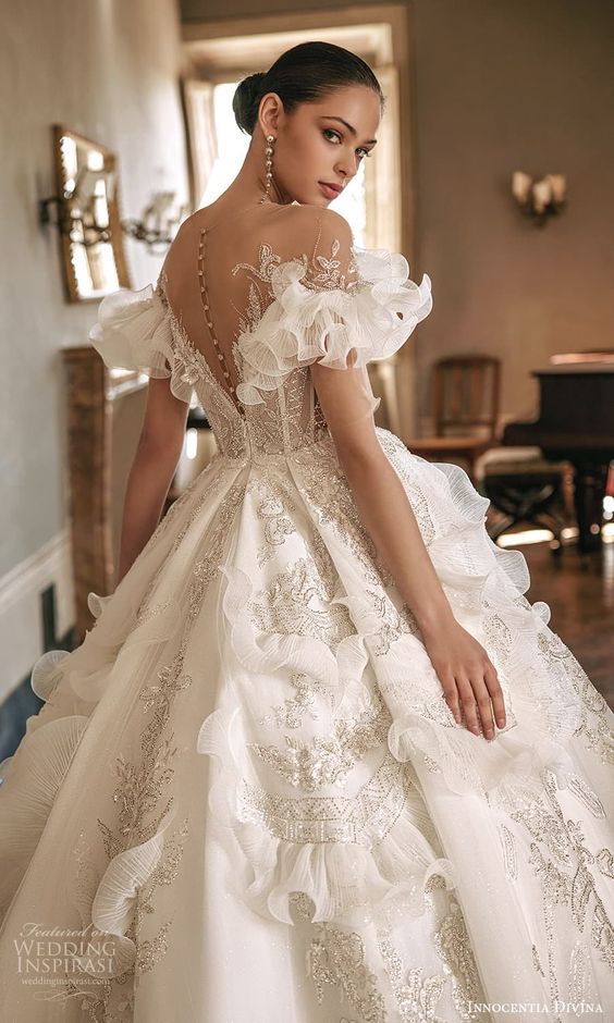 In this gown, traditional lace is given a whimsical update with off-the-shoulder sleeves and transparent details. It’s a dress that speaks to the long sleeve lace trend while keeping the look modern classic. The A-line silhouette is soft and flowing, suitable for a bride who treasures both elegant and romantic elements in her bridal style.
