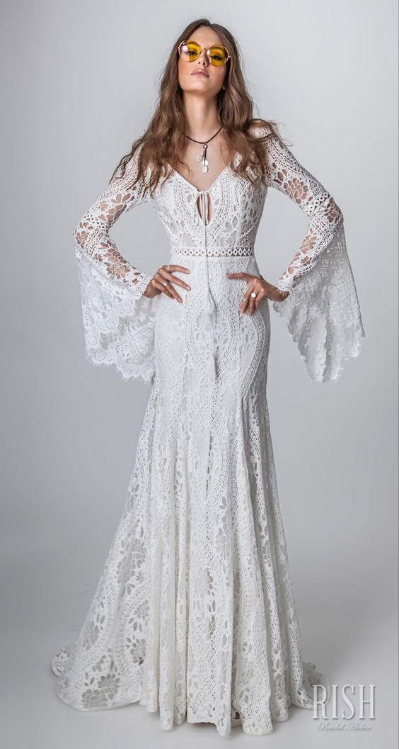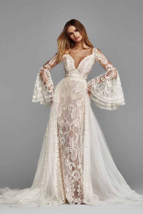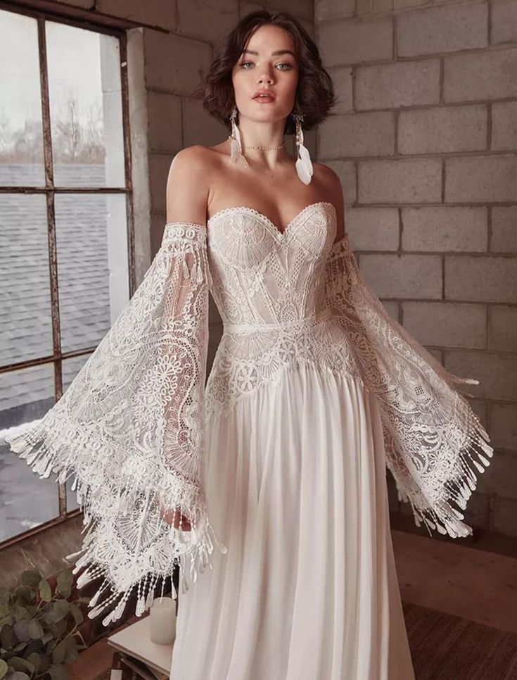 The sleeves bohemian vintage inspired look is perfect for brides wanting to reminisce about old-world charm while still rocking a modern vibe.