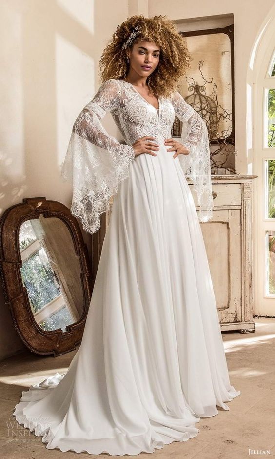 Combining the romantic touch of long sleeves with delicate lace, this dress is every boho bride’s dream. It whispers tales of old love stories and timeless commitments.