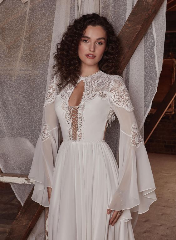Delicate long sleeve dresses, adorned with lace, bring forth a regal yet earthy aura.