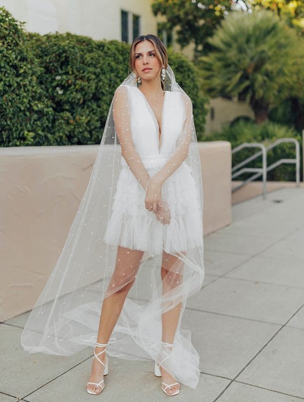 This image captures a bride in a short and playful tulle dress, a refreshing departure from the traditional long gown. Paired with a simple, yet sophisticated, tulle veil adorned with subtle embroidered polka dots, this ensemble is for the modern bride who delights in elegant simplicity and a touch of whimsy.