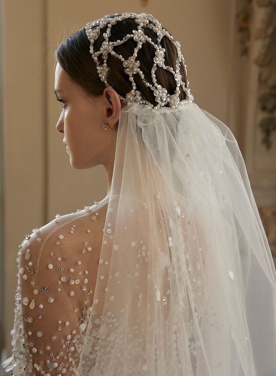 The last image showcases a breathtaking veil, rich with embroidered pearls and sequins, cascading down from an elegant headpiece. This style is for the bride who desires a unique look that combines the classic veil with floral and embroidered aesthetic details.