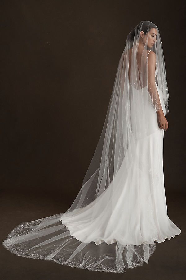 Styling Tip: Enhance this sophisticated look with a sleek chignon and diamond earrings that mirror the veil’s shimmering accents.