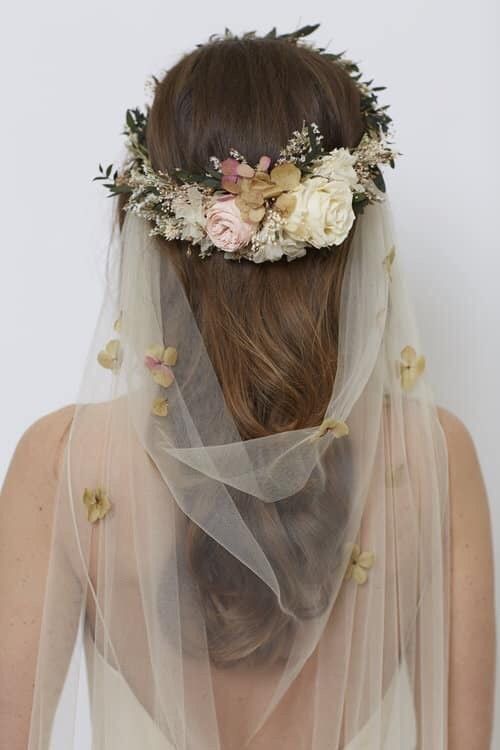 Here we see a bride who embraces nature and vintage charm. A boho-inspired floral crown rests atop a tulle veil adorned with delicate blossoms, a nod to earthy aesthetics. The vintage dress, with its light and airy feel, complements the floral headpiece, making it a dreamy choice for an outdoor or rustic-themed wedding.