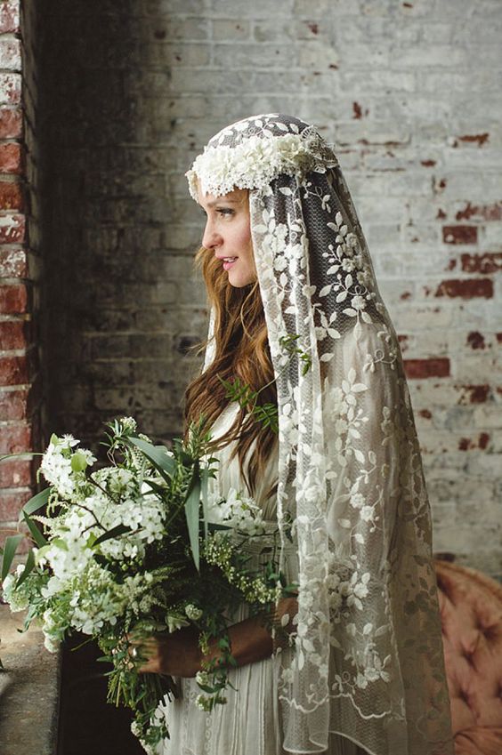 This image showcases a bride draped in a lace veil with a vintage pattern that whispers stories of old-world elegance. The long veil, complete with a lace trim and cap, is reminiscent of a bygone era, perfect for the bride with an affinity for vintage romance and classic beauty.