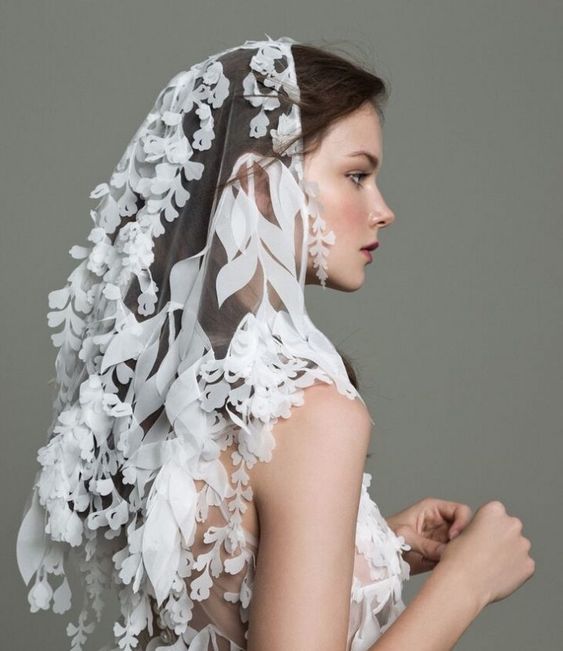 A modern take on bridal veils, this piece is adorned with floral appliqués that give life to the tulle fabric. The veil offers a unique and aesthetic appeal, suited for the bride looking for something unique and elegant. This floral veil can be paired with a simple gown to maintain focus on its intricate details.