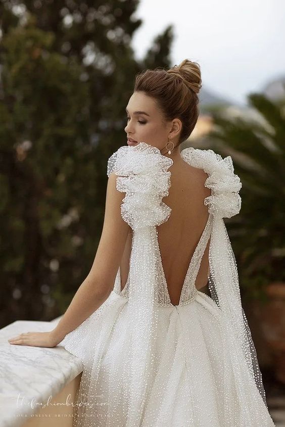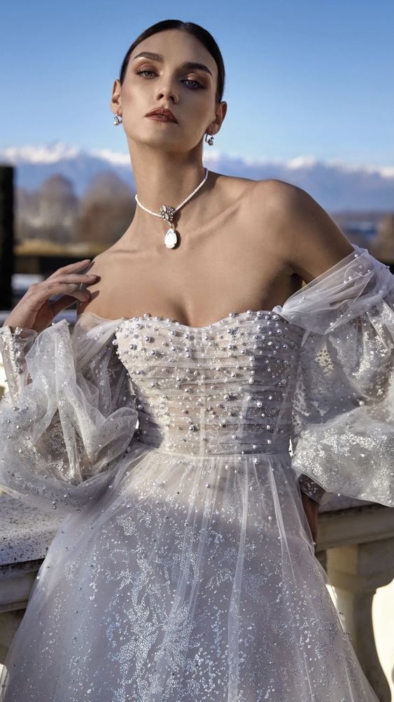 Lastly, this gown whispers tales of old-world charm with its puffed sleeves and open back, adorned with delicate beading that scintillates with every step. The skirt, a sea of sequins and soft tulle, creates a classy elegant statement, marrying 2024’s penchant for intricate detail with a silhouette that’s as timeless as love itself.