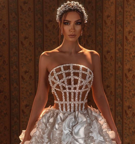 A vision in beads, this strapless gown with a corset-like bodice offers a striking balance between classy elegant allure and regal boldness. The full skirt, a cascade of satin and ruffles, brings a sense of grandeur to the 2024 trend of simple elegant design, making it a perfect fit for a lavish celebration or a sophisticated courthouse ceremony.