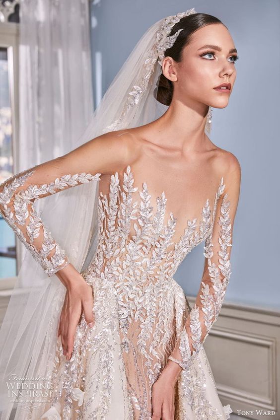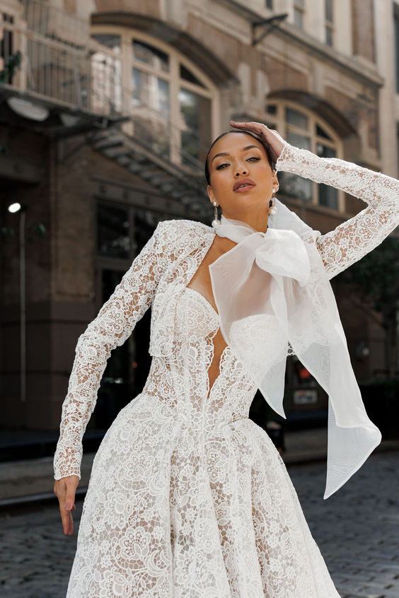 Here we have a gown that seems to float on a cloud of dreams. Its sheer, long sleeves and delicate lacework speak to the bohemian style and aesthetic vintage trends that have become a hallmark of 2024’s bridal fashion. This dress, with its intricate leaf-like embroidery, is tailor-made for the bride who carries a forest fairytale in her heart.
