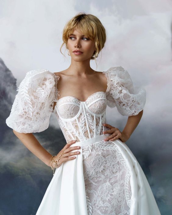 This gown is a confection of lace and structure, marrying the modern sensibility of a corset with the romanticism of vintage puff sleeves. The classy bodice is a testament to the modern simple trend, while the lace overlay brings a whisper of bohemian style to a decidedly elegant silhouette.
