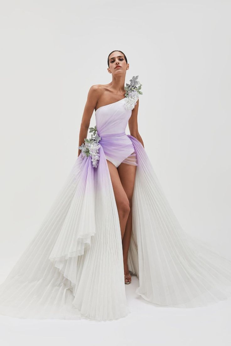 In a union of sleek modern design and elegant simplicity, this gown redefines classy elegance. With a one-shoulder bodice and a trail of flowers cascading down the side, it offers an asymmetrical twist to the 2024 trend new. The flowing tulle adds a dynamic movement, making it a standout choice for the bride who is both a minimalist and a dreamer.