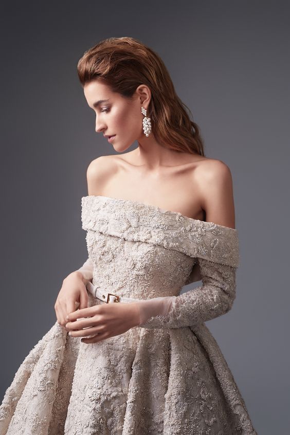 Our final vision is a breathtaking blend of the modern elegant and Italian flair, a gown that combines the classy elegant with a chic, off-the-shoulder design. The exquisite beading and embroidery create a texture-rich masterpiece, a simple elegant yet sophisticated dress that is the epitome of 2024’s bridal trends.
