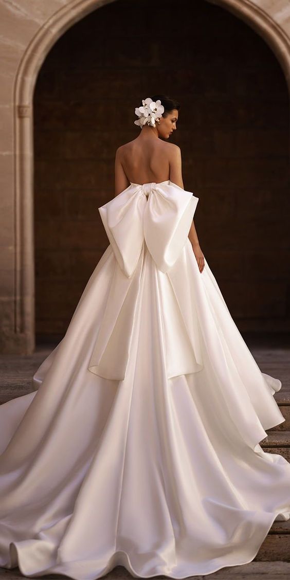 Turning heads with its monumental bow and dramatic train, this gown is a standout piece in the wedding dresses chic – 2024 collection. The sleek satin exudes a classy elegant vibe, while the bold design is undeniably modern. It’s an architectural wonder, perfect for the bride who is her own work of art.