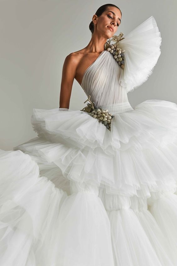 Echoing the statuesque grace of Grecian goddesses, this one-shouldered gown adorned with unique embellishments and a cinched waist is a modern take on ethereal beauty. The cascading ruffles add a bohemian style whimsy, making this creation ideal for a vintage or princess-themed wedding. It is a sartorial symphony for brides seeking a classy elegant aura with a twist of fantasy.