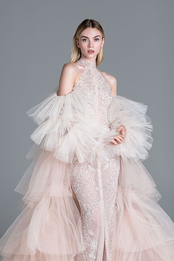 Capturing the delicate dance between aesthetic vintage and modern simplicity, this gown is a dream woven in soft tulle and sparkling beads. The high neck and the full, layered skirt with a subtle blush hue is reminiscent of the romantic ballets, ideal for a bride who embodies the simple elegant ethos with a penchant for the dramatic.