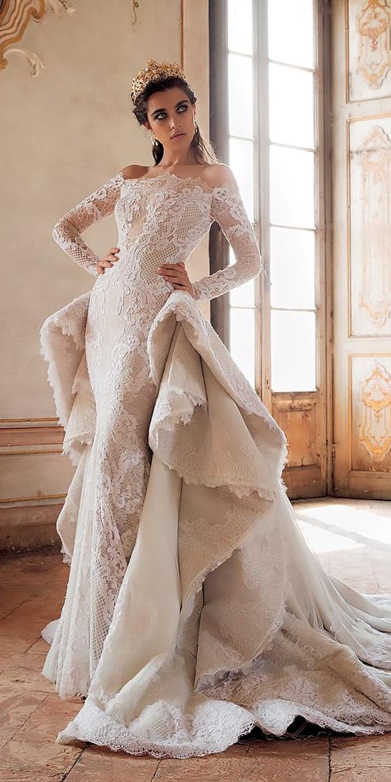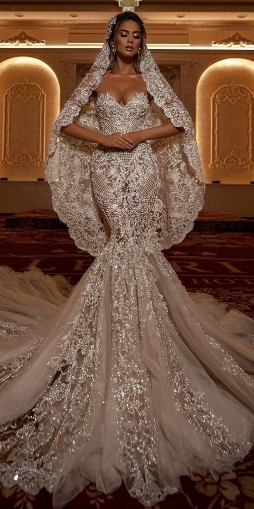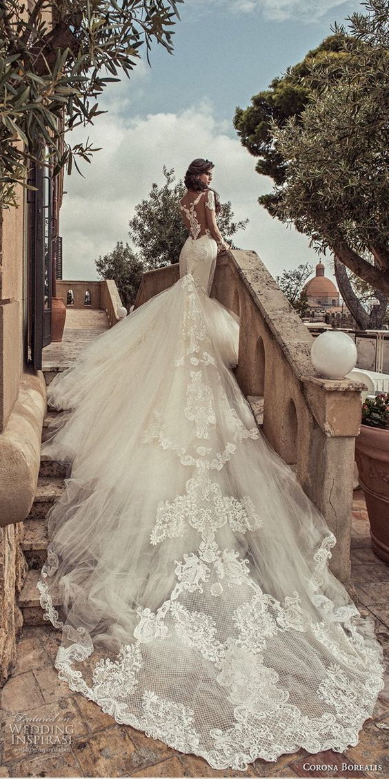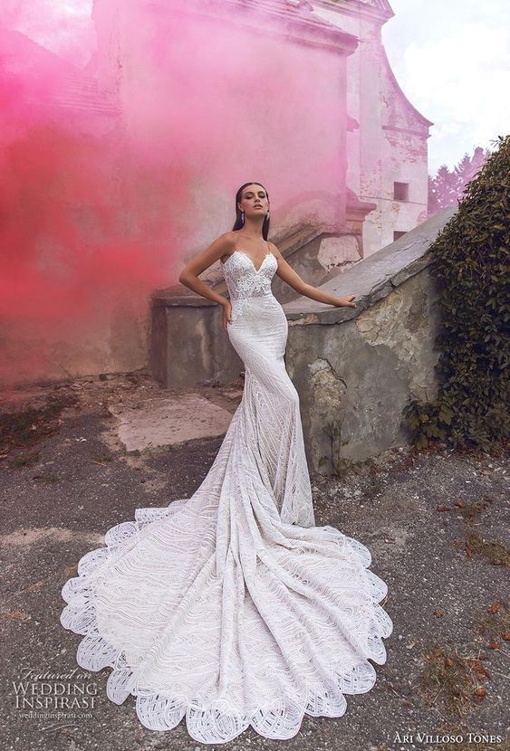 Last but not least, we’re transported to the sun-kissed shores of the Mediterranean with a gown that’s a dream woven in lace. The long train is a canvas of delicate lacework, echoing the intricate details of ancient architecture. This elegant and classy creation pairs beautifully with a cathedral veil, making it the epitome of a timeless wedding dress for the bride who carries the spirit of romance wherever she goes.